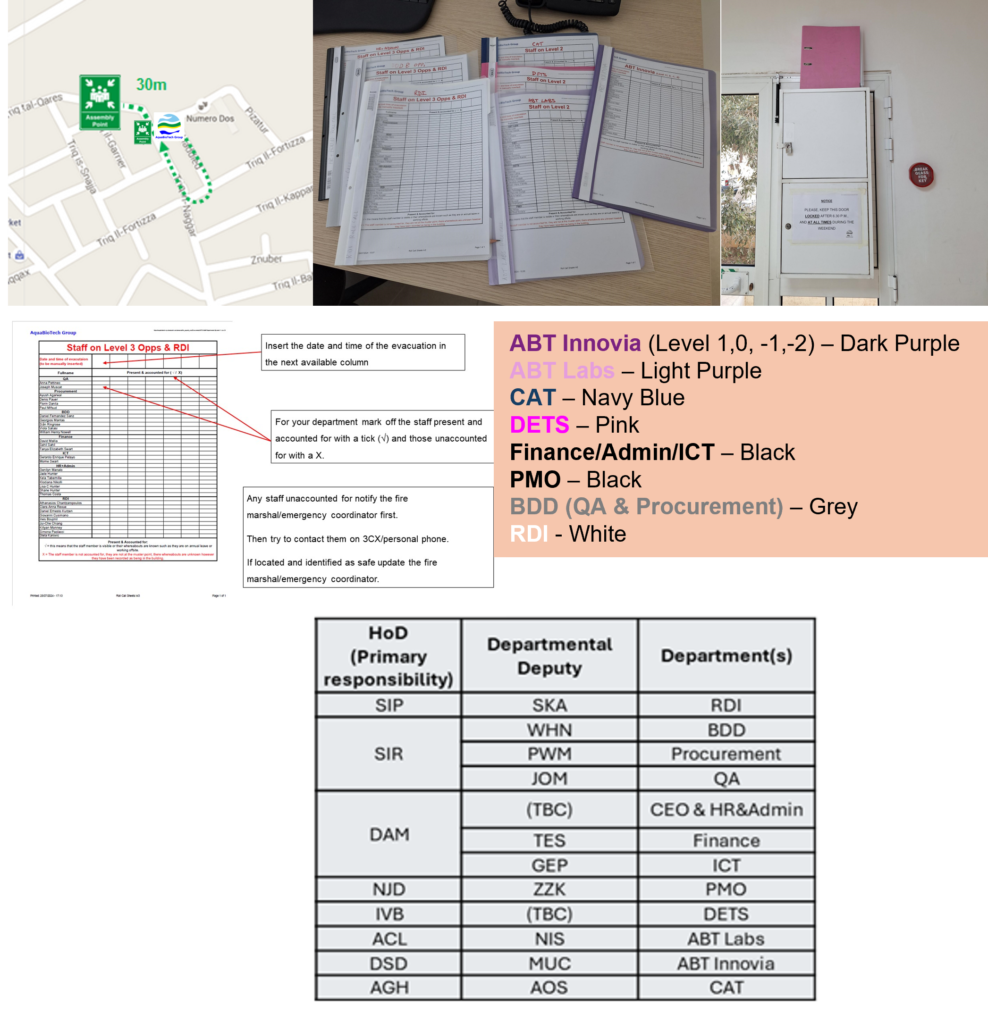 As Primary roll caller on your exit you will find a PINK Leaver Arch file on top of the post box – DO NOT REMOVE THIS FROM THE BUILDING.  Inside contains a number of coloured folders with the roll call lists for each level and/or department.  The files are colour co-ordinated according to department as highlighted in the below, Roll callers (primary and Secondary) have also be noted below.  On exiting the building, please collect and remove only the roll call folder unique to your department, it will contain a pencil for you to mark off who is present.  Add the date and time of the evacuation to the top of the sheet (as indicated below) and then mark with a tick or a cross against accounted and unaccounted staff. You will receive a WhatsApp message from ICT with a list of all staff who were present in the building at the time of the alarm – use this to check for unaccounted staff.